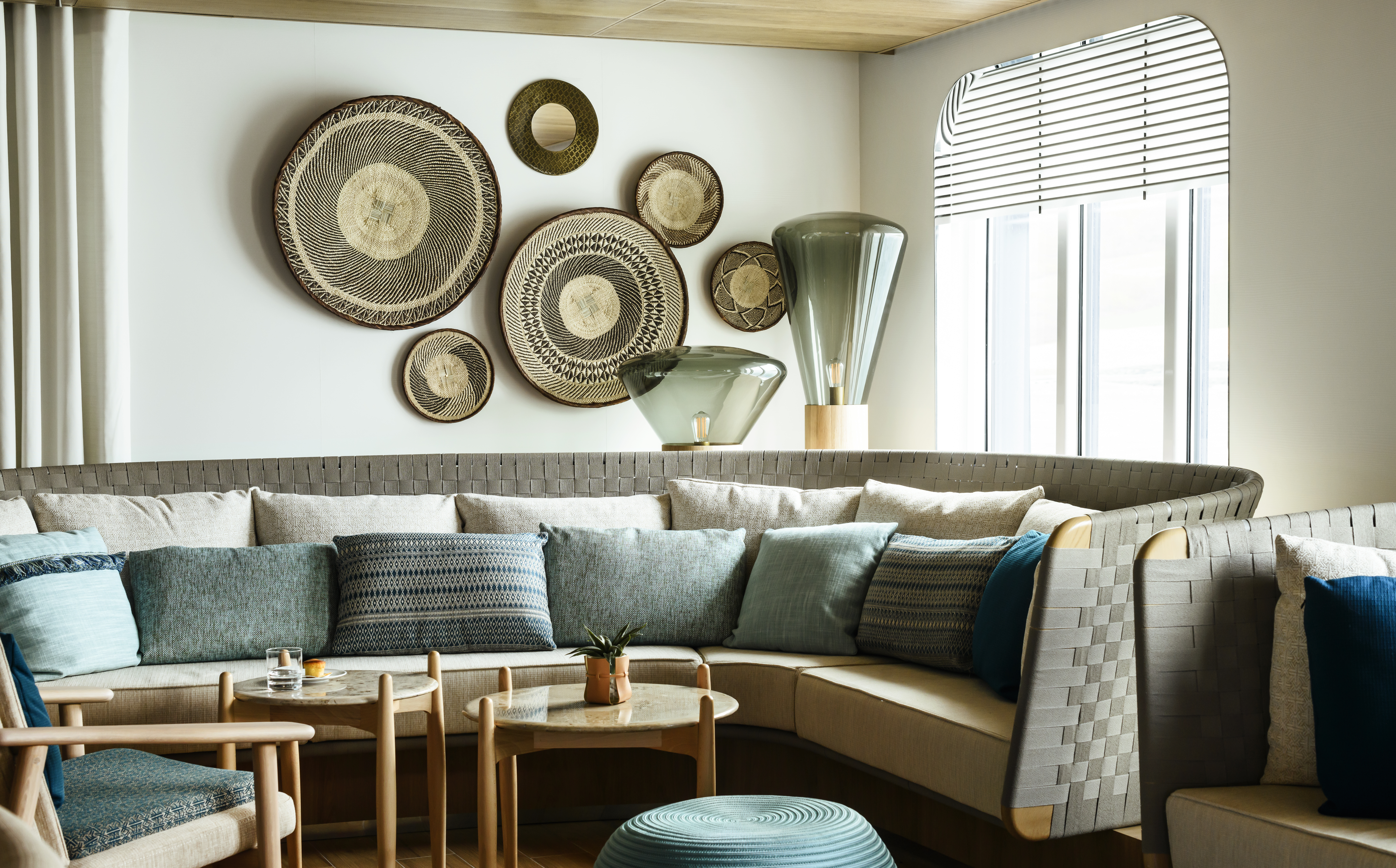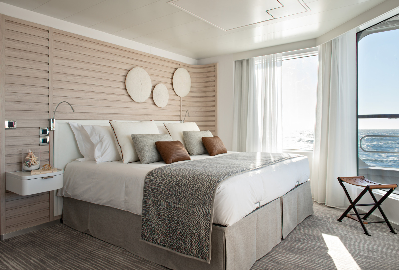 Sur l’ensemble des PONANT EXPLORERS, le designer Jean-Philippe Nuel a imaginé une décoration raffinée et contemporaine aux inspirations ethniques. Une ambiance douce et reposante portée par un assortiment de matières et couleurs chaleureuses. Sur chacun des 6 Navires, Les Ateliers LENGLART se sont vu confier la Confection, l’Installation et Mise en forme des Rideaux, Stores, Décors de Lit et Coussins des 92 Cabines, Suites et Espaces Communs ainsi que les banquettes extérieures sur mesures.