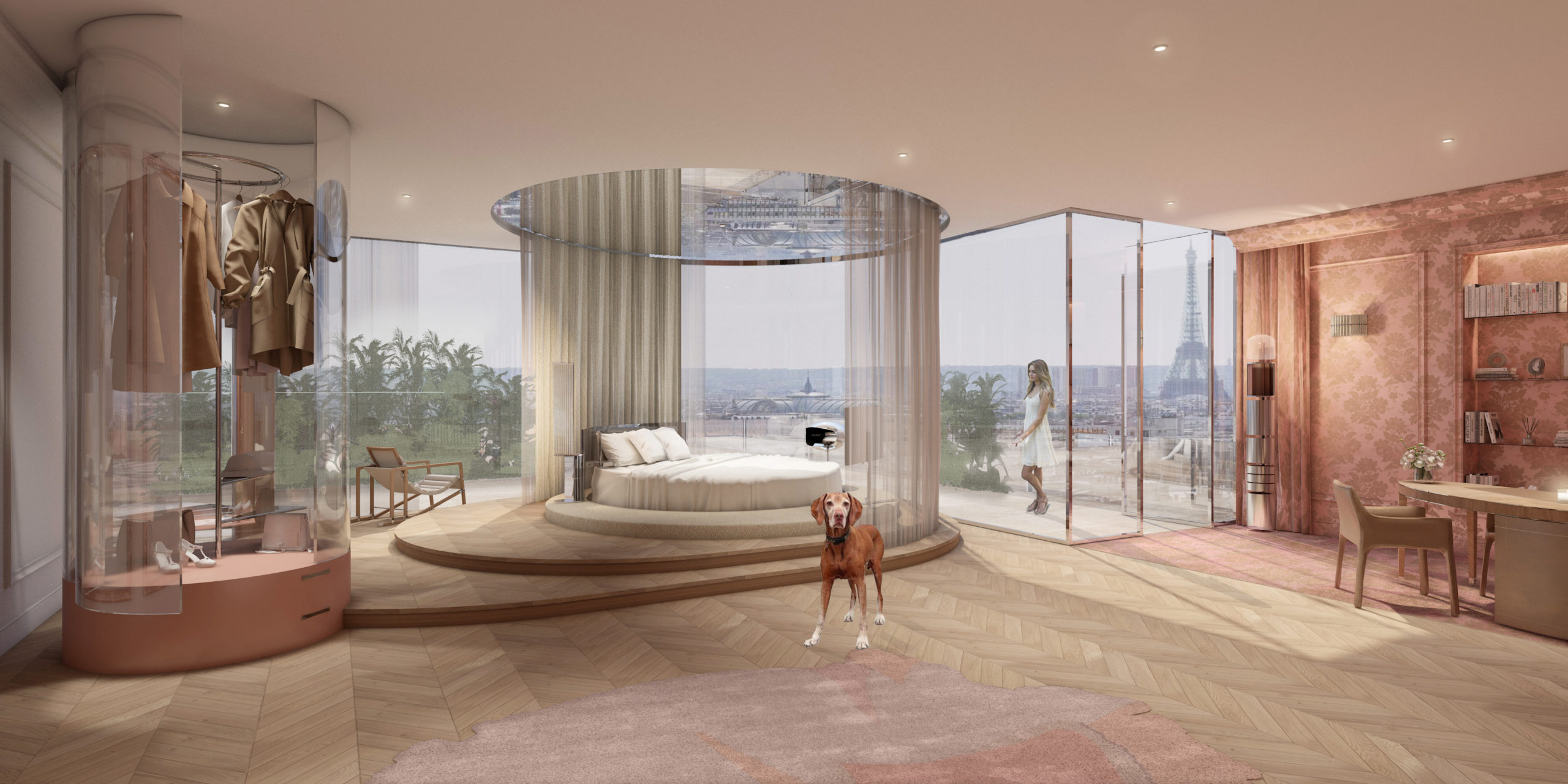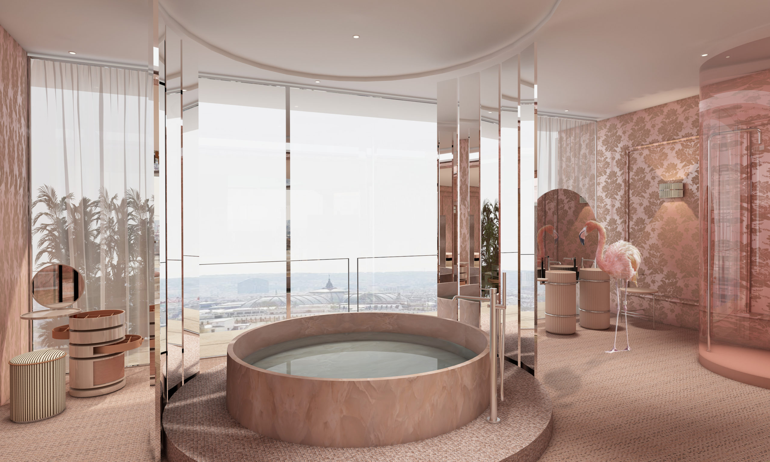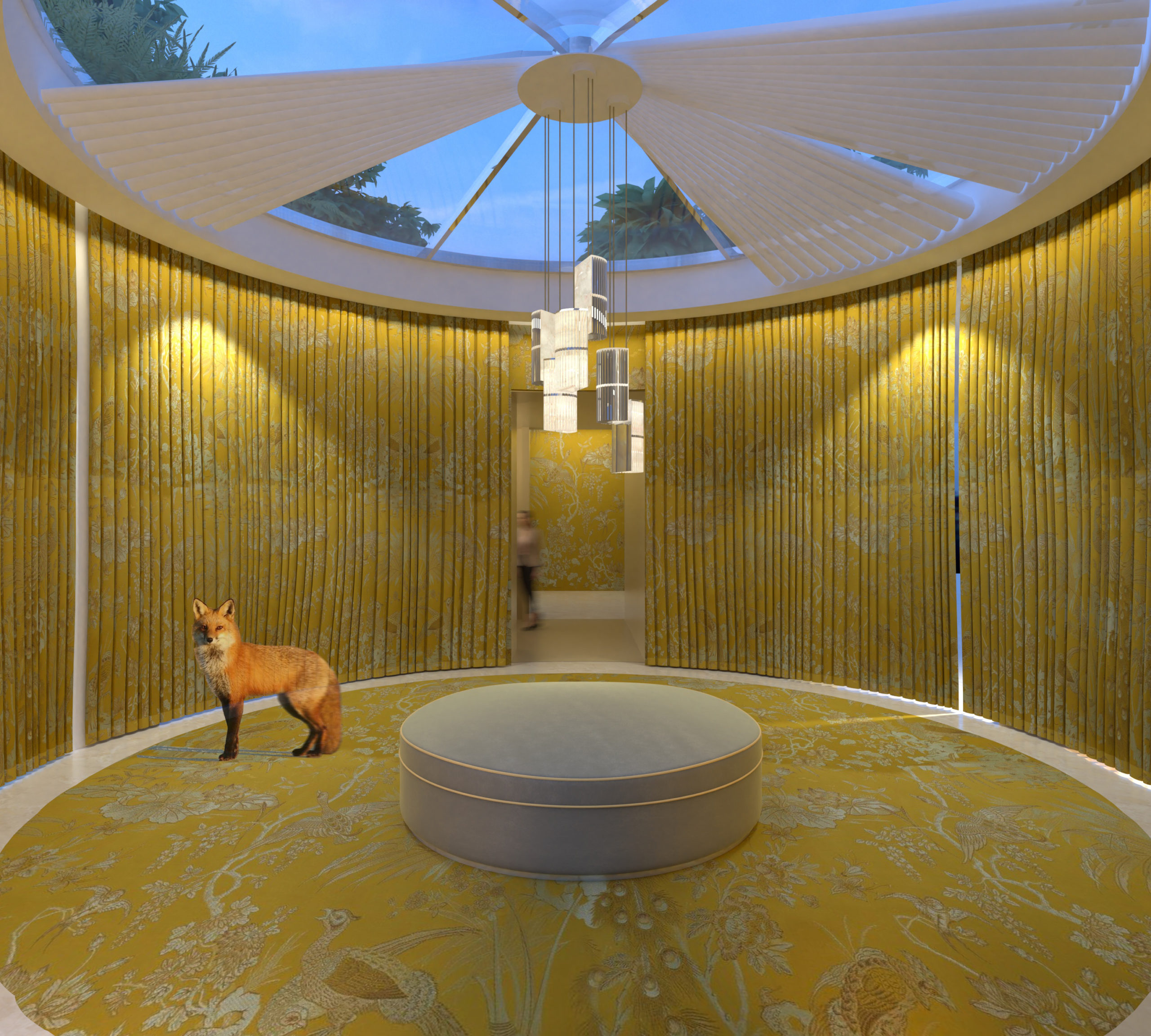 Cet espace hybride raconte une histoire extravagante et poétique le temps d’une soirée, d’un séjour, d’un évènement. On y retrouve de nombreux voilages aux ampleurs généreuses, des fines moulures gainés et surtout de magnifiques Rideaux Plissés conçus par les ateliers LENGLART. Dans cet échange Adrien et Aristide Lenglart discutent avec Laurent de la naissance des Rideaux Plissés (Gamme Origami), de leur intégration dans le projet et l’importance de la confection dans le tombé et l’atmosphère finale des décors.